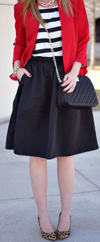 Наденьте простую черную юбку-трапецию и полосатый топ. Дополните образ красным жакетом и колье. Вы уведёте внимание с бедер на верх вашей фигуры и покажете красивую грудь.