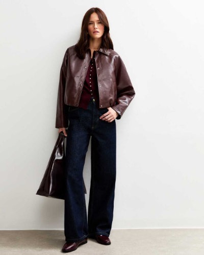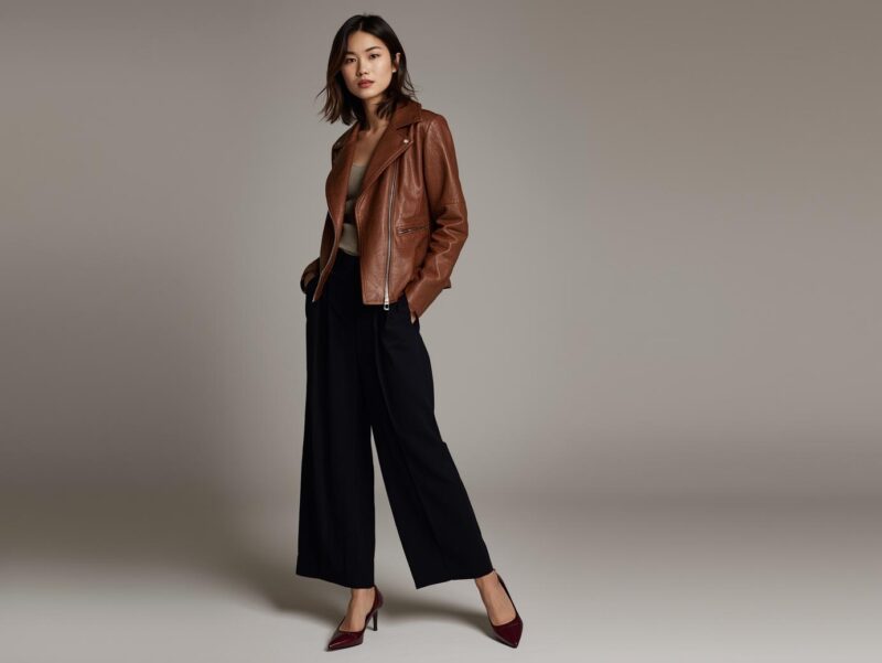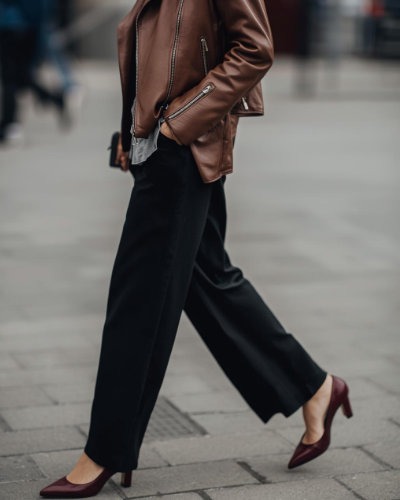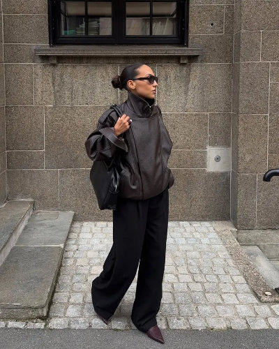 5. Коричневая кожаная куртка + свободные чёрные брюки + бордовые туфли с острым носком