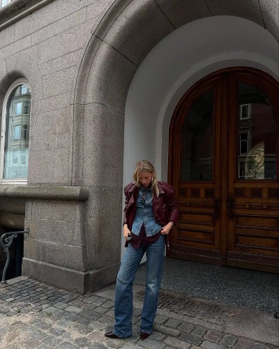 2. Джинсы + бордовая блузка на пуговицах + бордовая кожаная куртка + сапоги