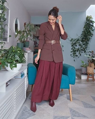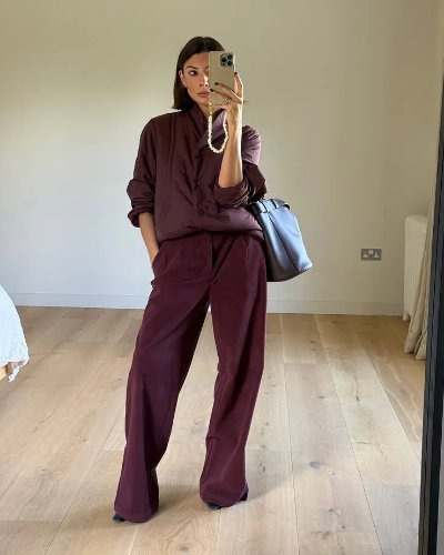 8. Бордовый жакет + объёмные бордовые брюки + коричневая кожаная сумка