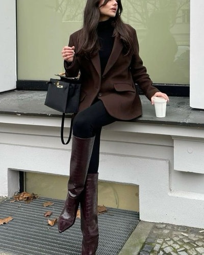 4. Коричневый жакет или коричневое пальто + бордовые сапоги