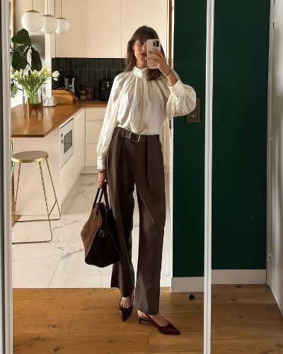 6. Изящная блузка + коричневые брюки + коричневая замшевая сумка + бордовые лодочки на низком каблуке