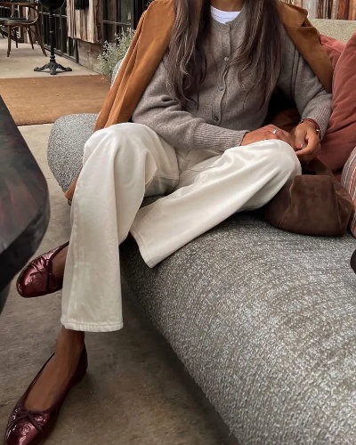 7. Бежевый жакет + светло-коричневый кардиган + белые джинсы + коричневая замшевая сумка + бордовые балетки