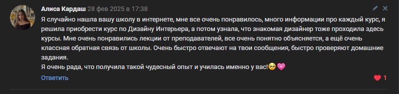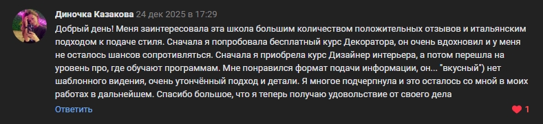 "Дизайн интерьера - это моя страсть, поэтому я решила пройти профессиональное обучение и получить базовые знания. Онлайн формат - это удобный способ для освоения новой професcии подобного плана!