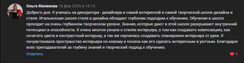 “Я - художник и веб-дизайнер по основному образованию и для получения новой квалификации я решила обучаться на курсе “Дизайнер интерьера” в Итальянской школе моды. И это действительно оказалось верным решением.