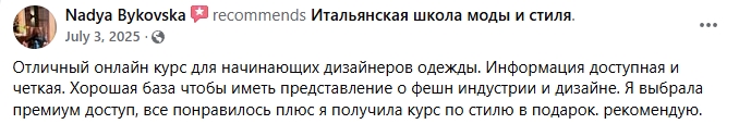 Мне нравится учиться у профессионалов Итальянской школы моды и стиля. Все чётко и по делу, это очень близко к моему подходу к делу. Много примеров, отличная наполненность уроков. Ничего лишнего.