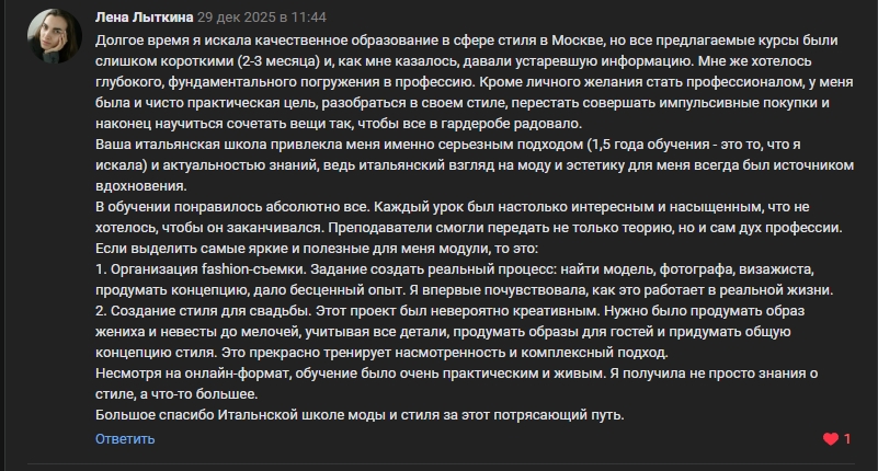 Здесь вы можете прочитать актуальные отзывы об обучении в Итальянской школе моды от реальных студентов, при желании связаться с ними и узнать объективное мнение.