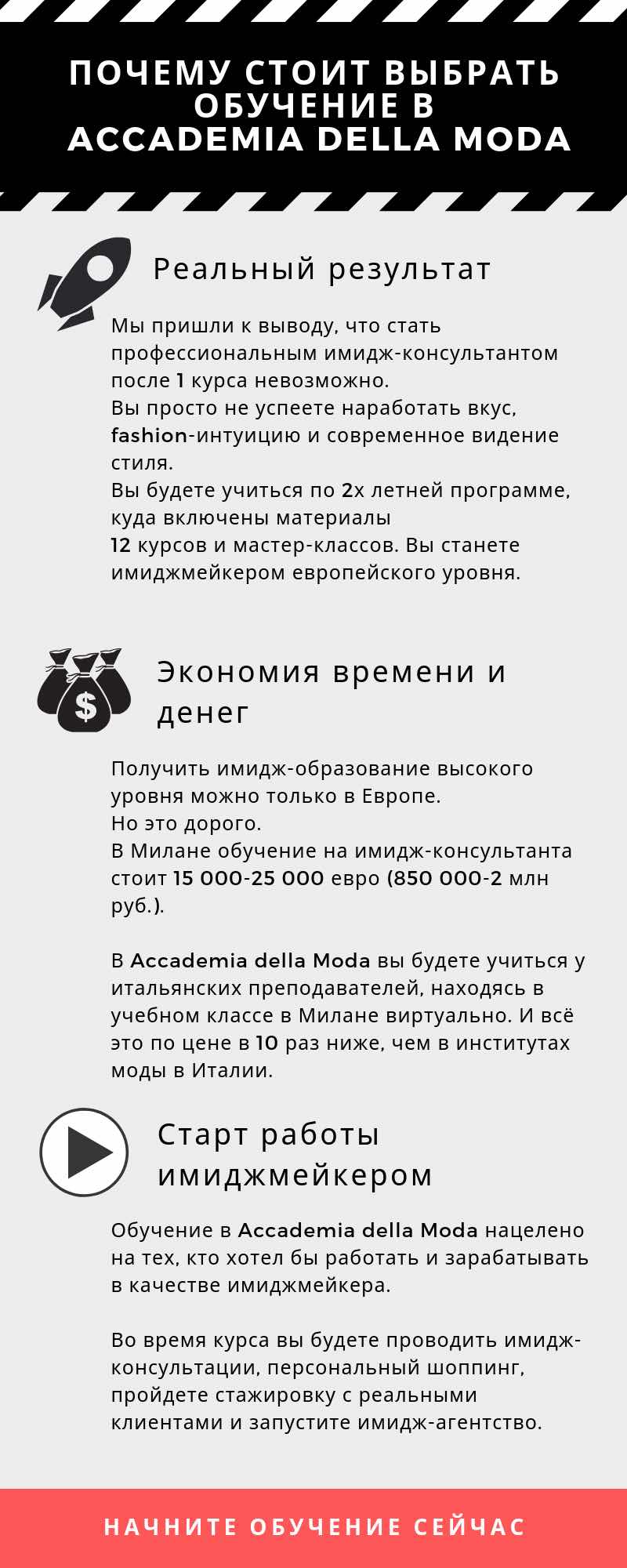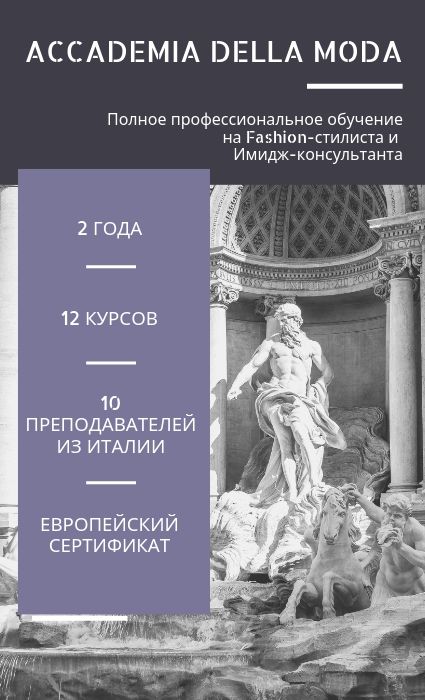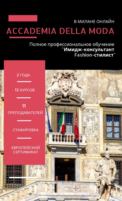 проходит обучение на стилиста-имиджмейкера на курсе Accademia della Moda.