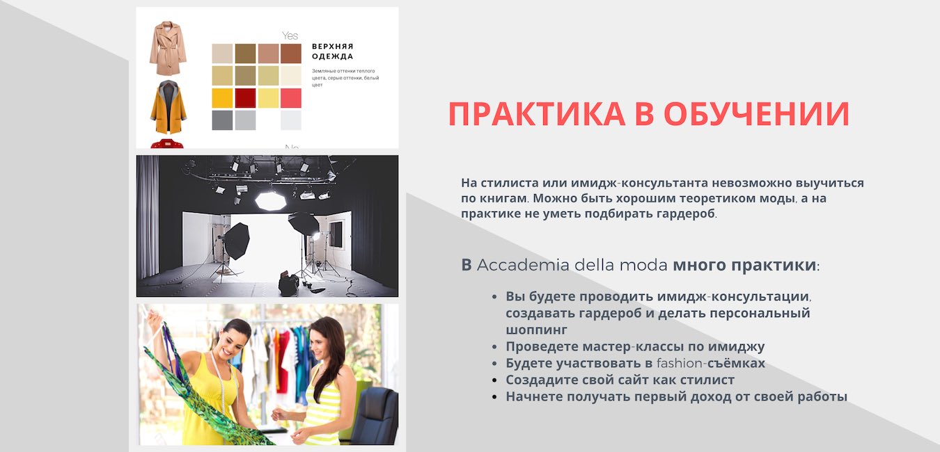 Во время обучения вы будете проводить имидж-консультации, персональный шоппинг, пройдете стажировку с реальными клиентами и запустите имидж-агентство.