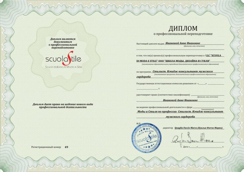 По итогам обучения вы получите диплом профессиональной переподготовки по специальности Стилист мужского гардероба + сертификат Итальянской школы на 2х языках
